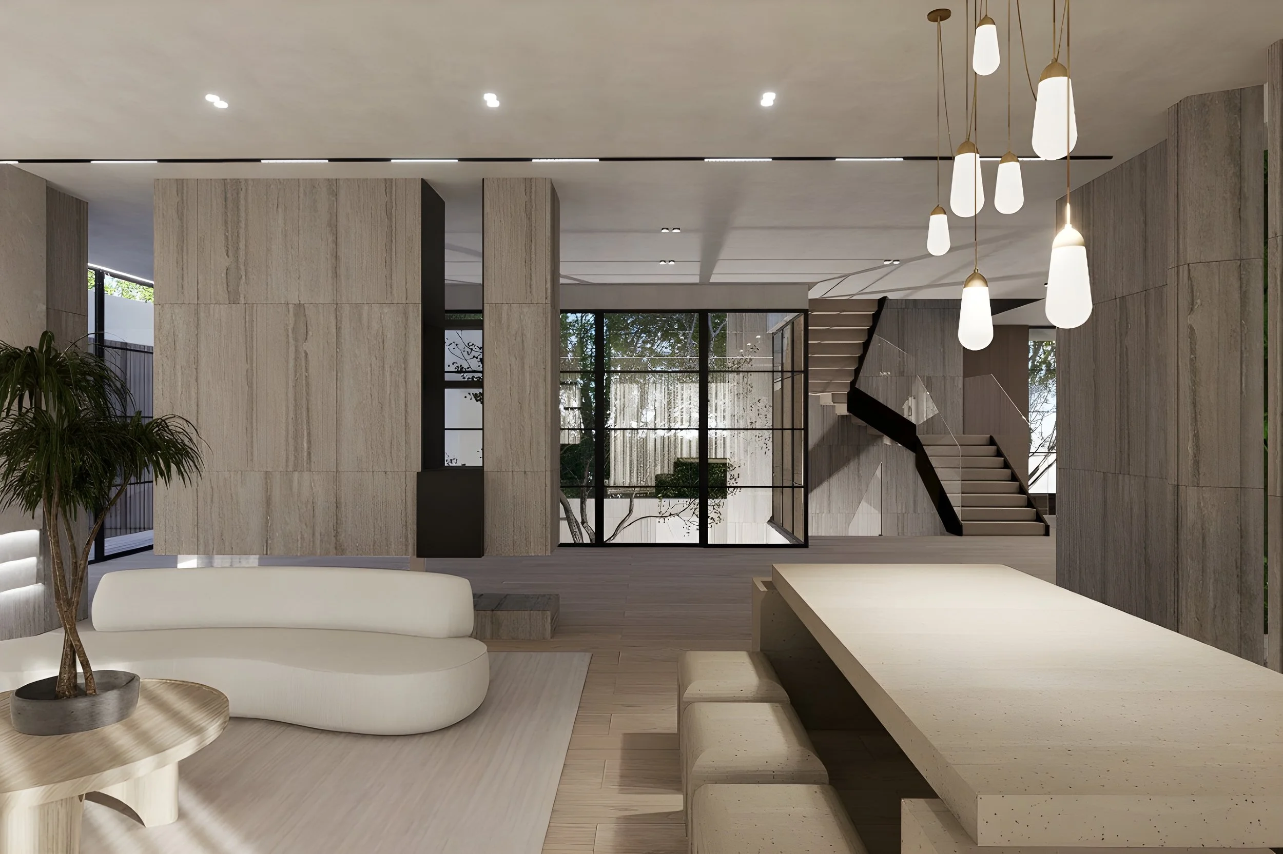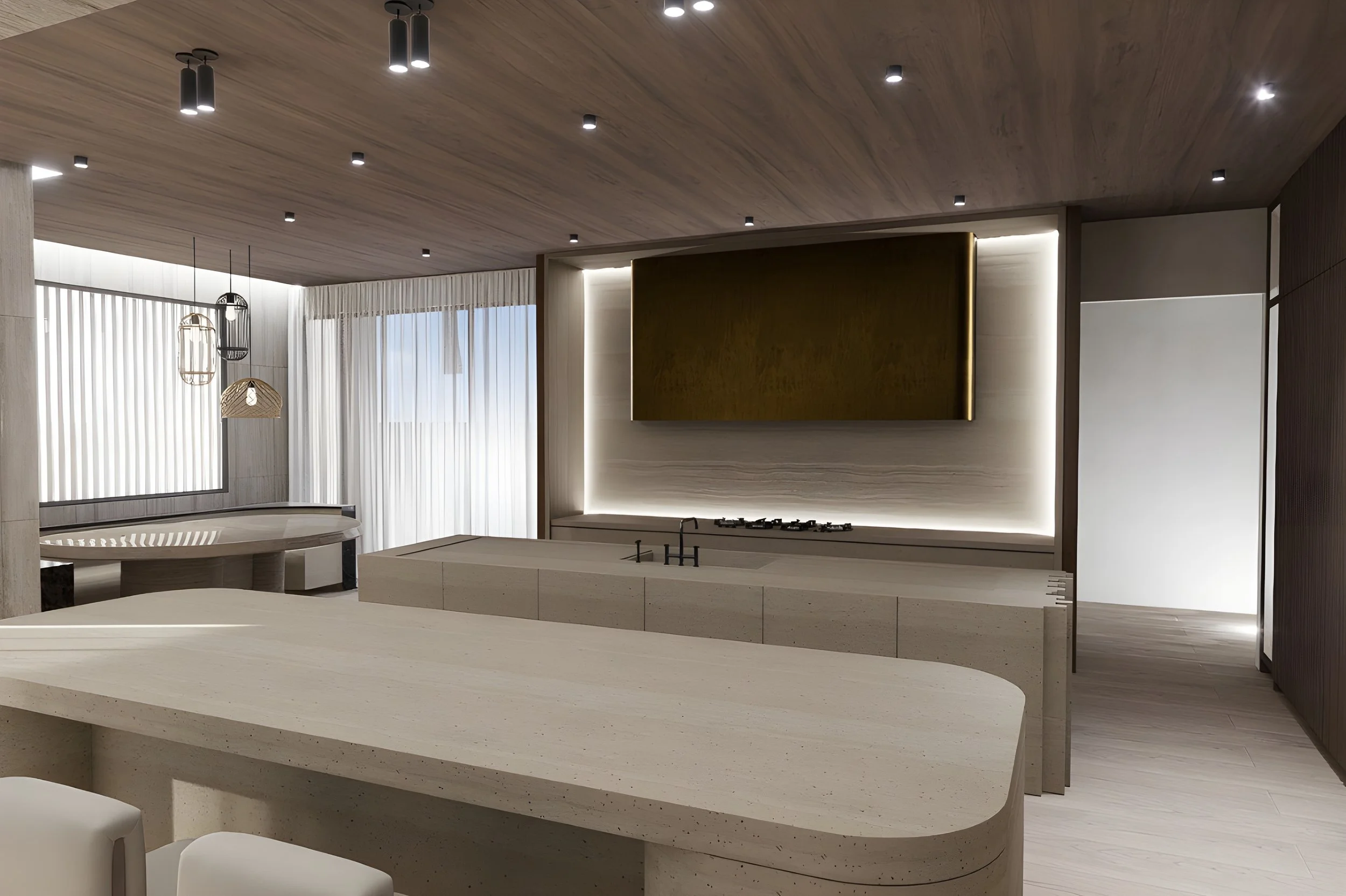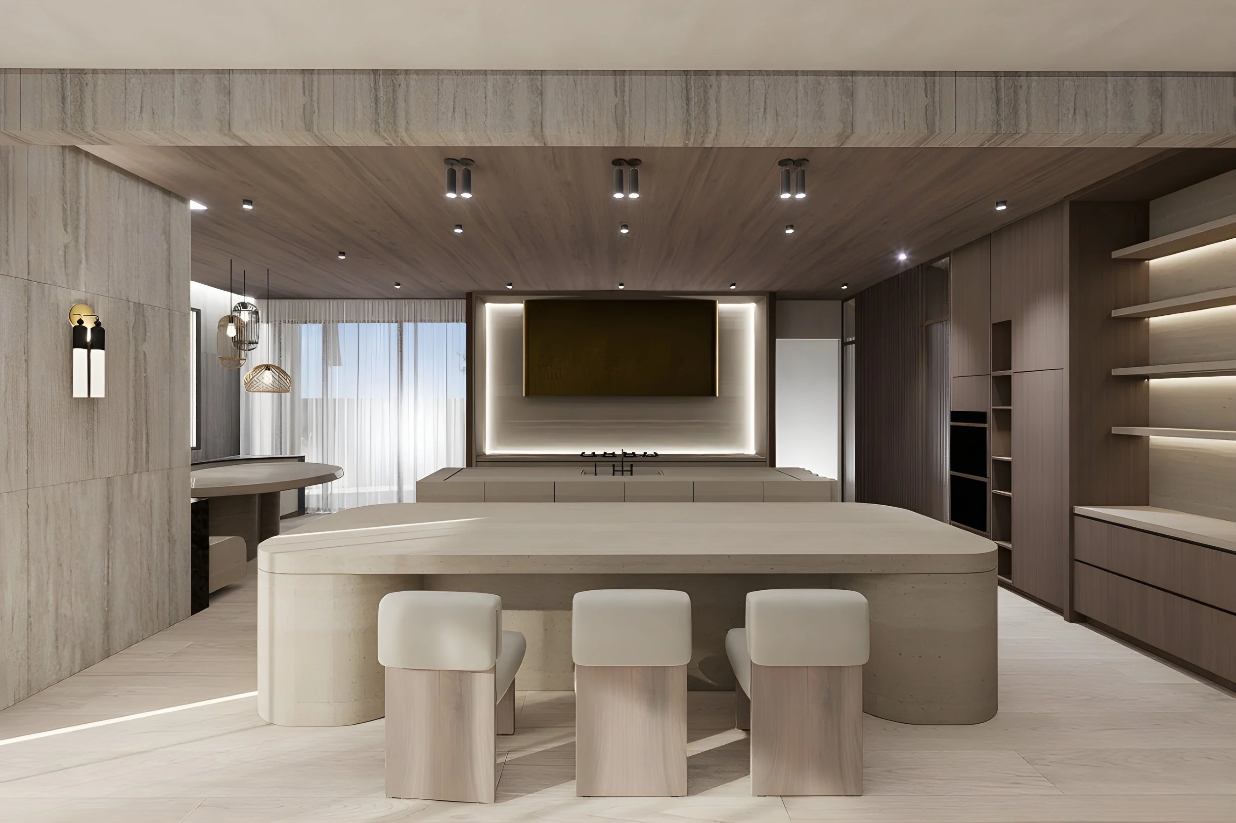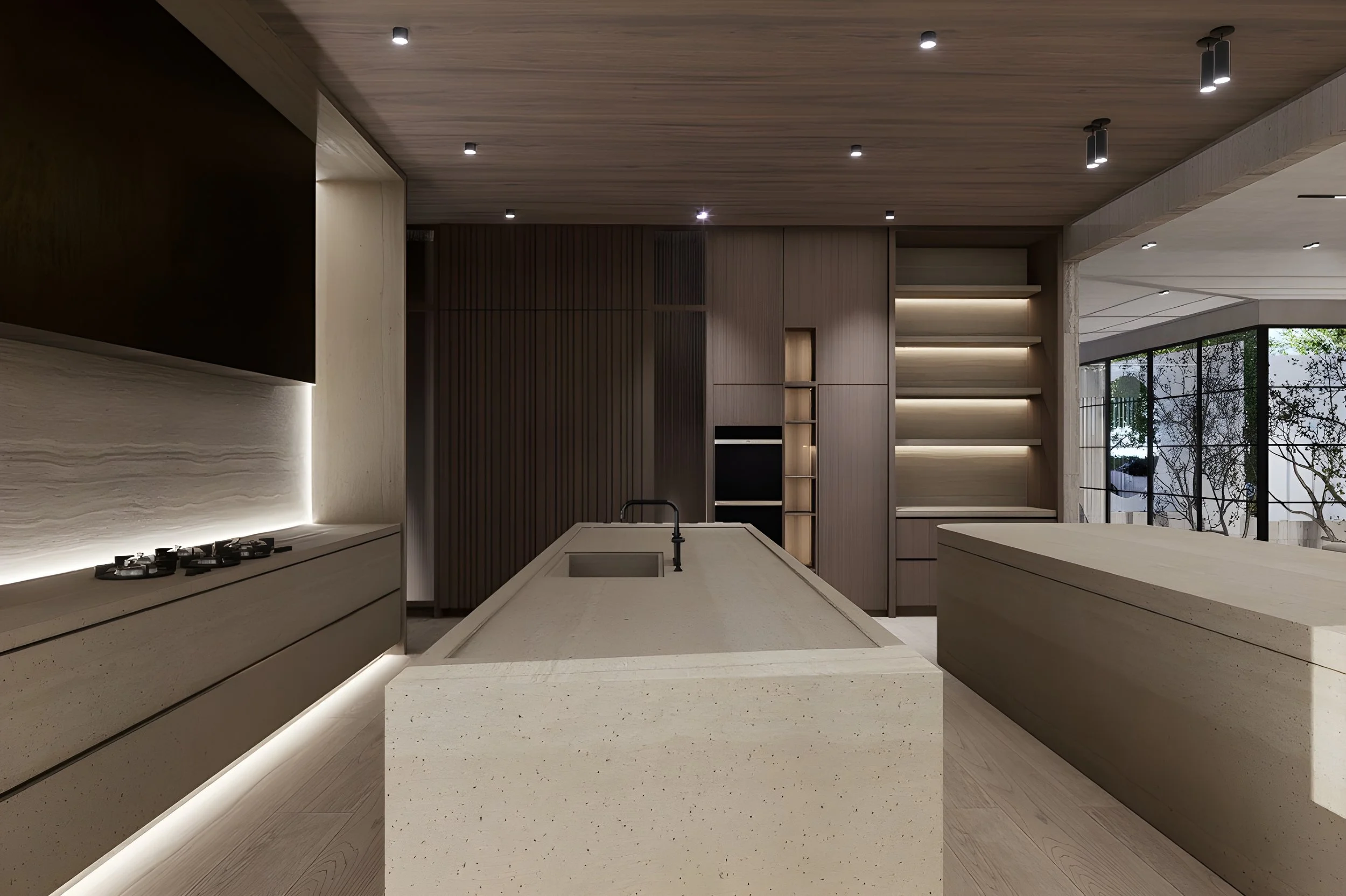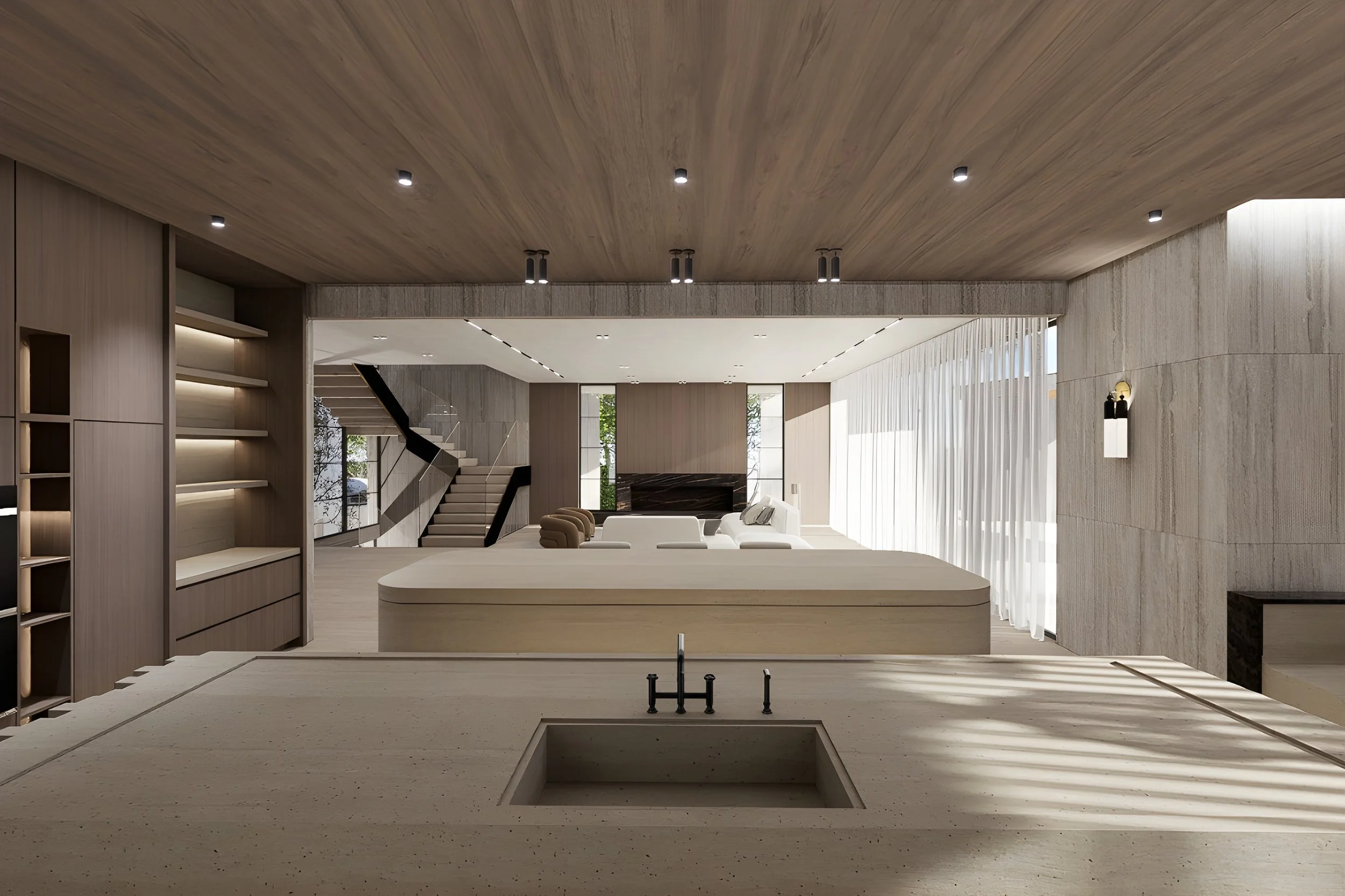 ALPINE is situated in the iconic Flats of Beverly Hills, a neighborhood where homes are admired not just for their architecture but for their presence on the street. The home is carved in elegance — a monolithic composition of warm, vein-cut travertine that anchors it in timeless serenity. The architecture is contemporary yet eternal, with linear geometry, floating planes, and expansive glazing. At the heart of the home are the kitchens — not just functional, but sculptural. Oversized islands emerge like art pieces from the wood floor, their volumes appear as if carved from a single block. Gallery-like. Iconic. Designed for conversation, creation, and quiet moments alike.