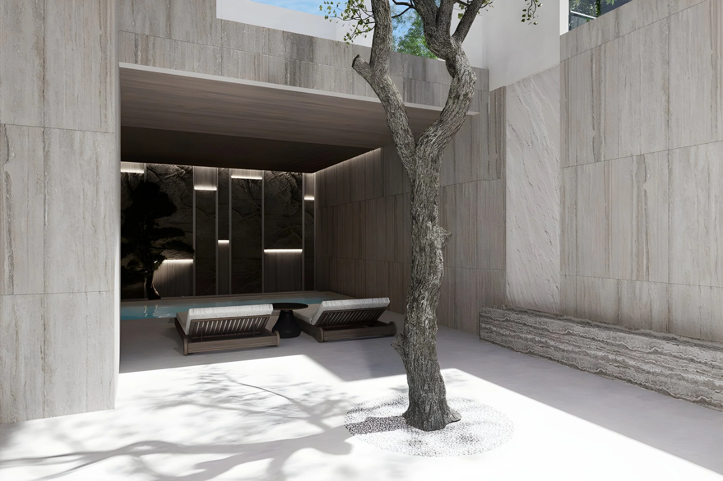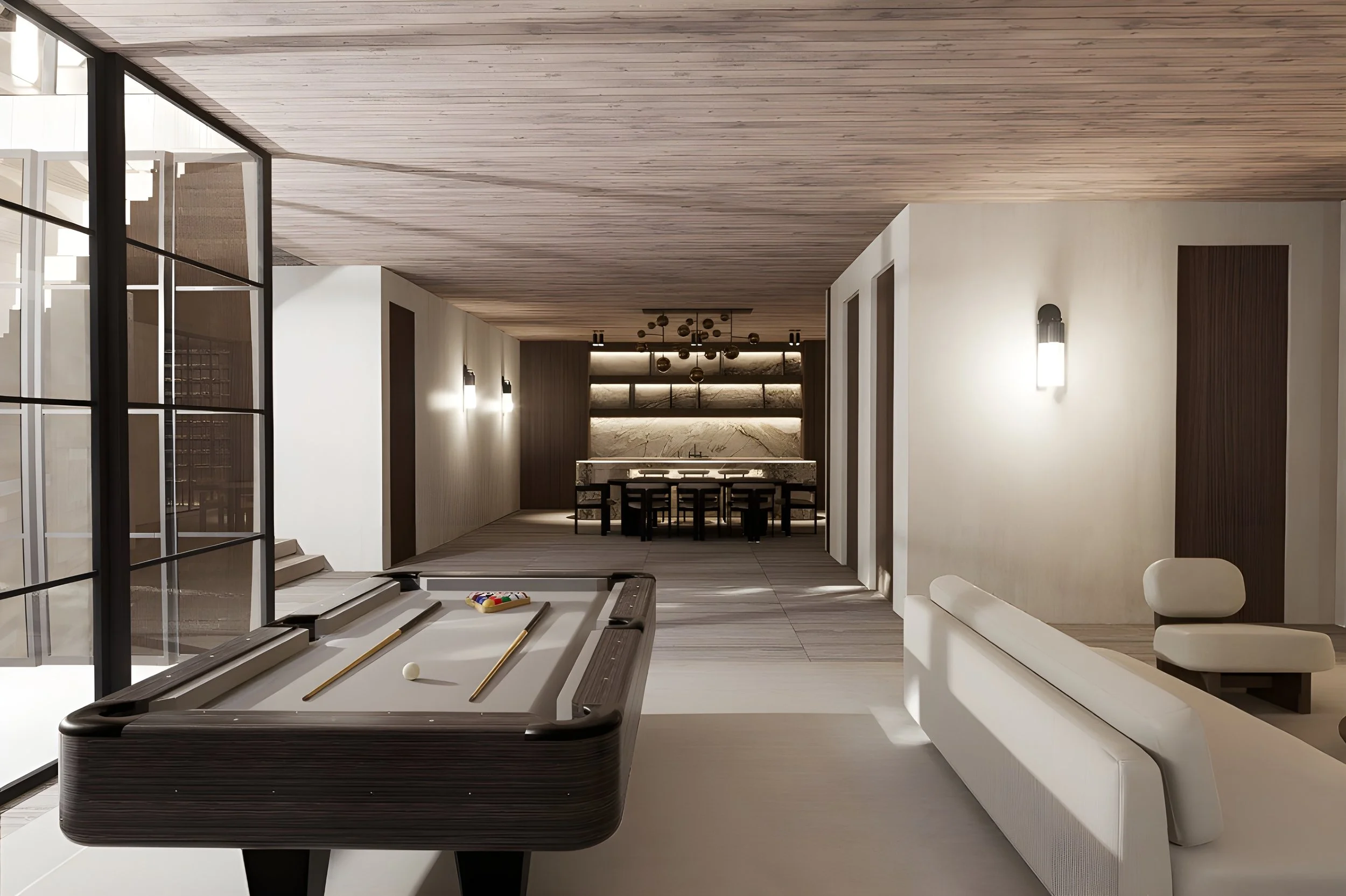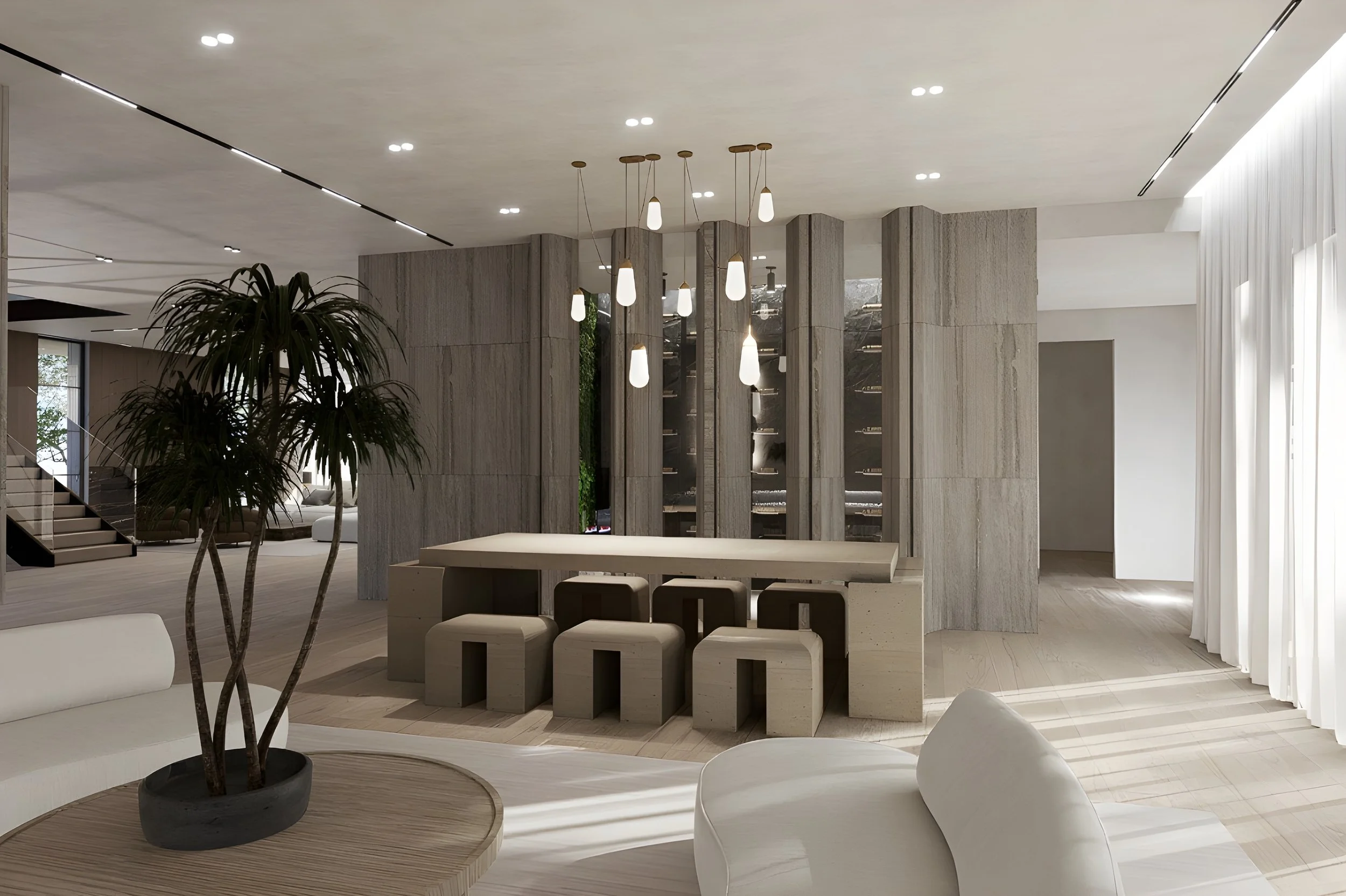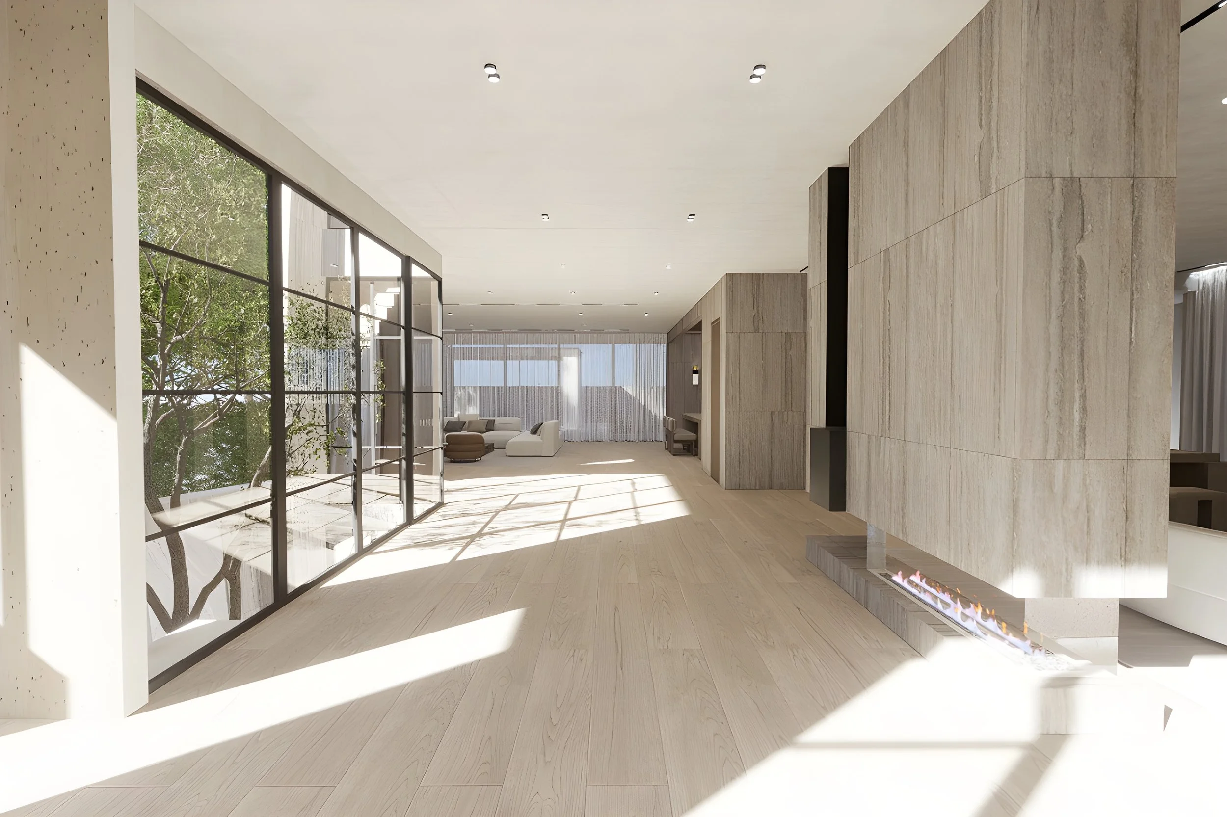 ALPINE is situated in the iconic Flats of Beverly Hills, a neighborhood where homes are admired not just for their architecture but for their presence on the street. The home is carved in elegance — a monolithic composition of warm, vein-cut travertine that anchors it in timeless serenity. The architecture is contemporary yet eternal, with linear geometry, floating planes, and expansive glazing. At the heart of the home are the kitchens — not just functional, but sculptural. Oversized islands emerge like art pieces from the wood floor, their volumes appear as if carved from a single block. Gallery-like. Iconic. Designed for conversation, creation, and quiet moments alike.
