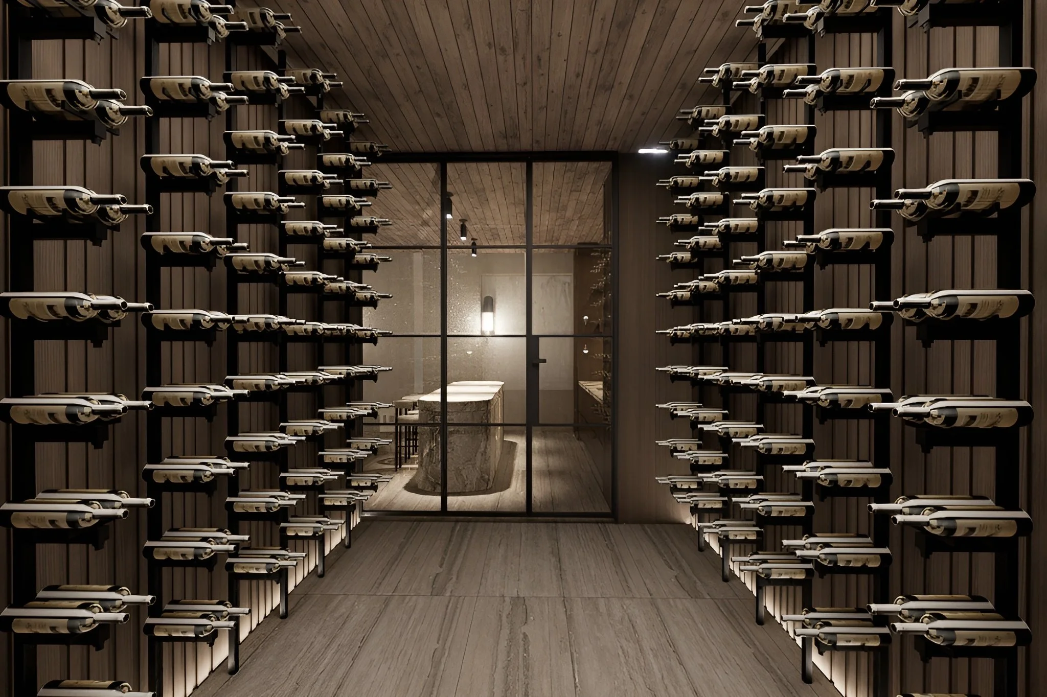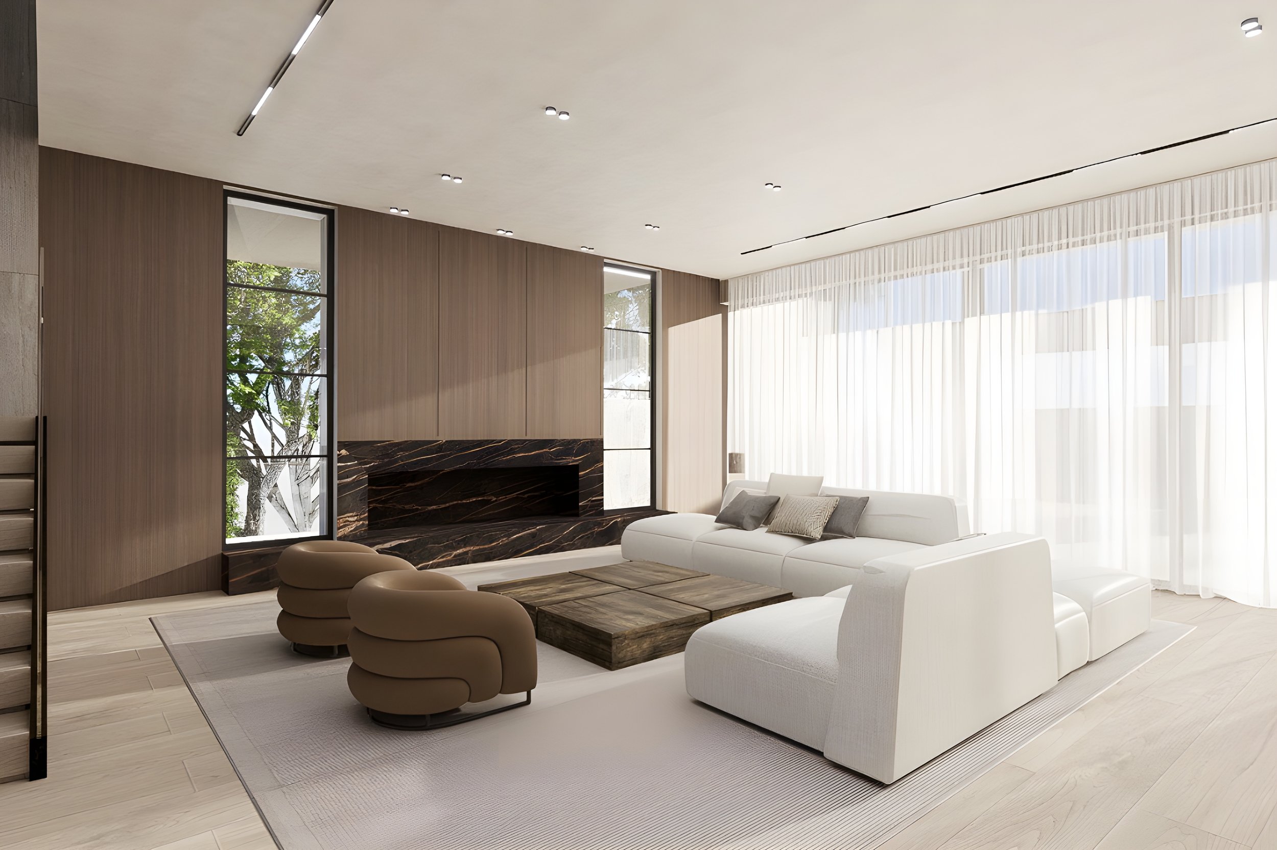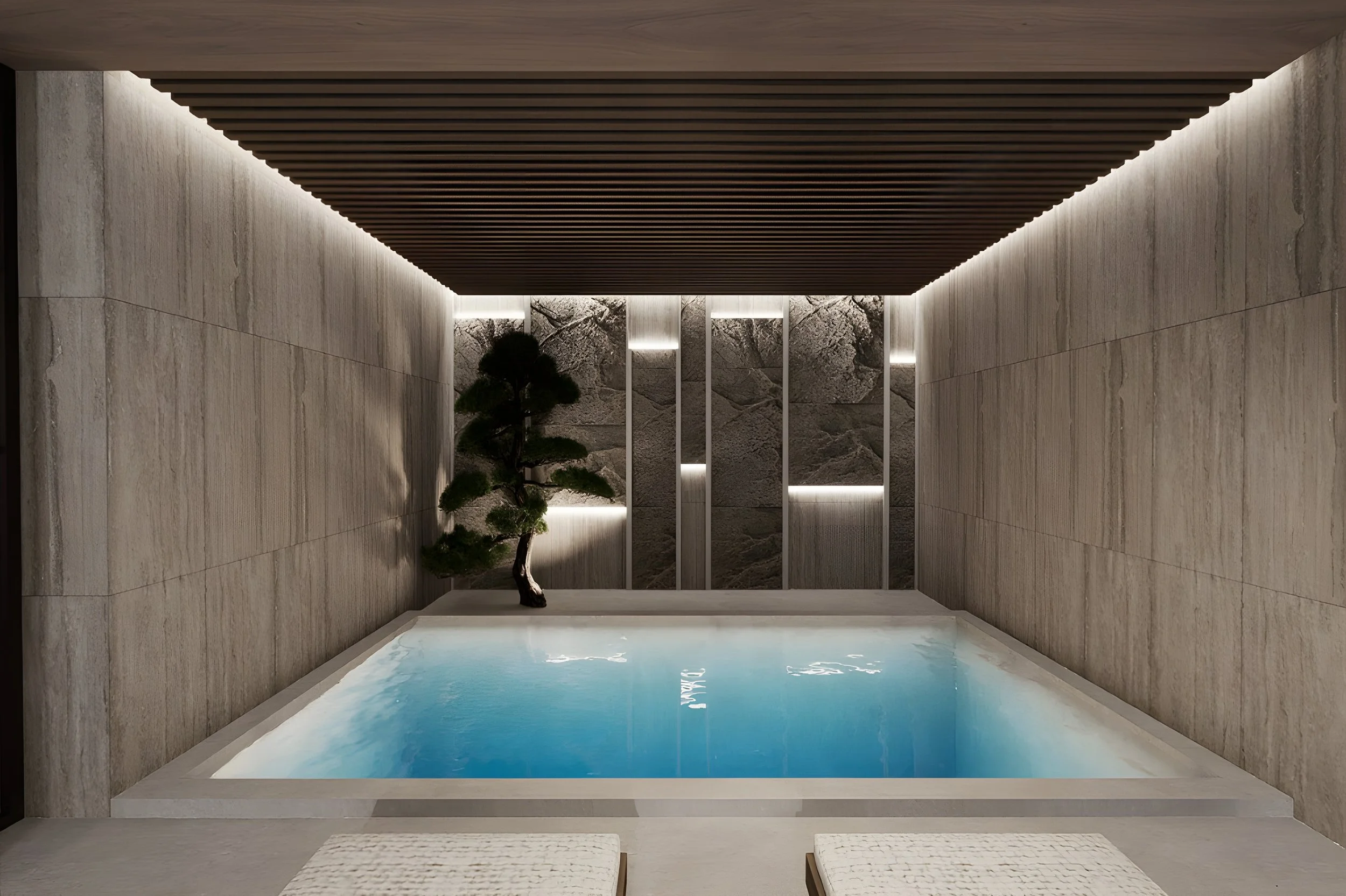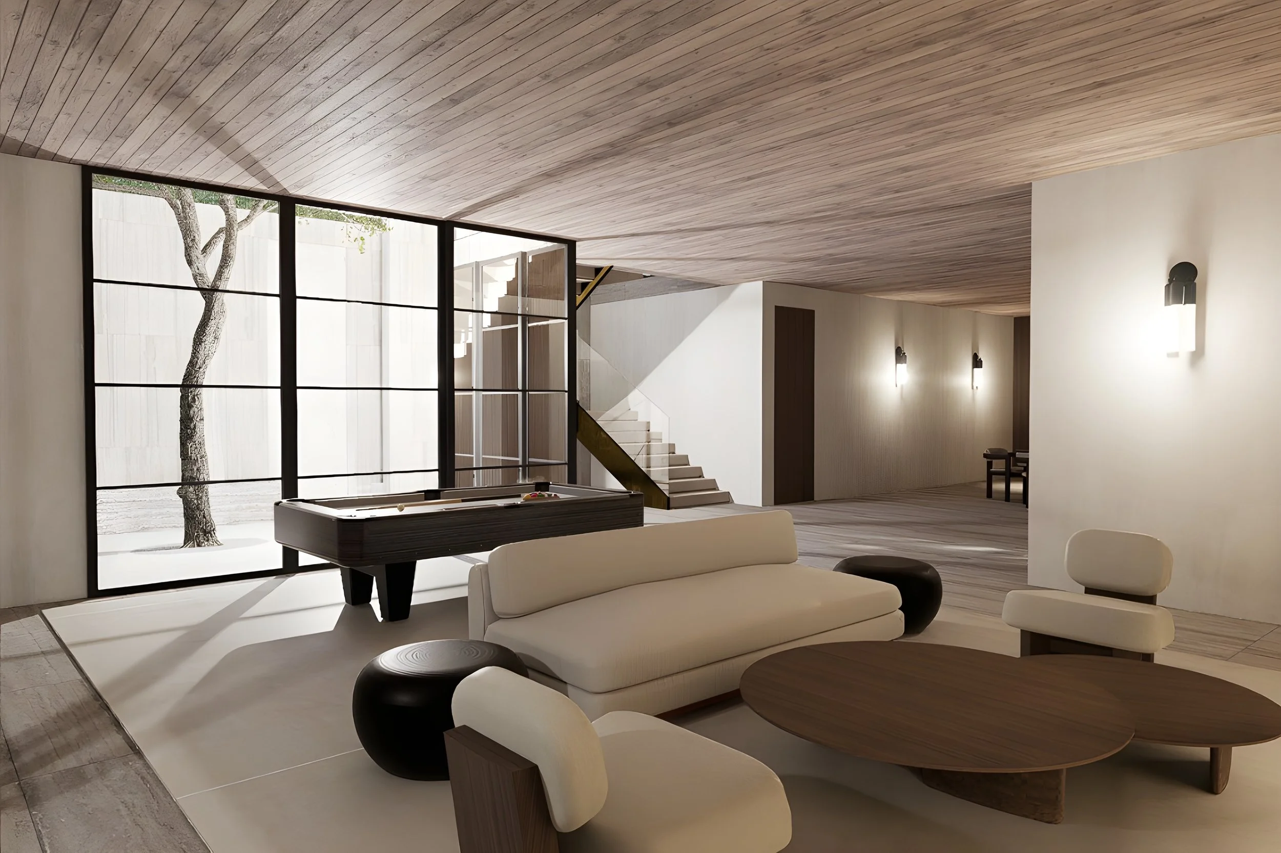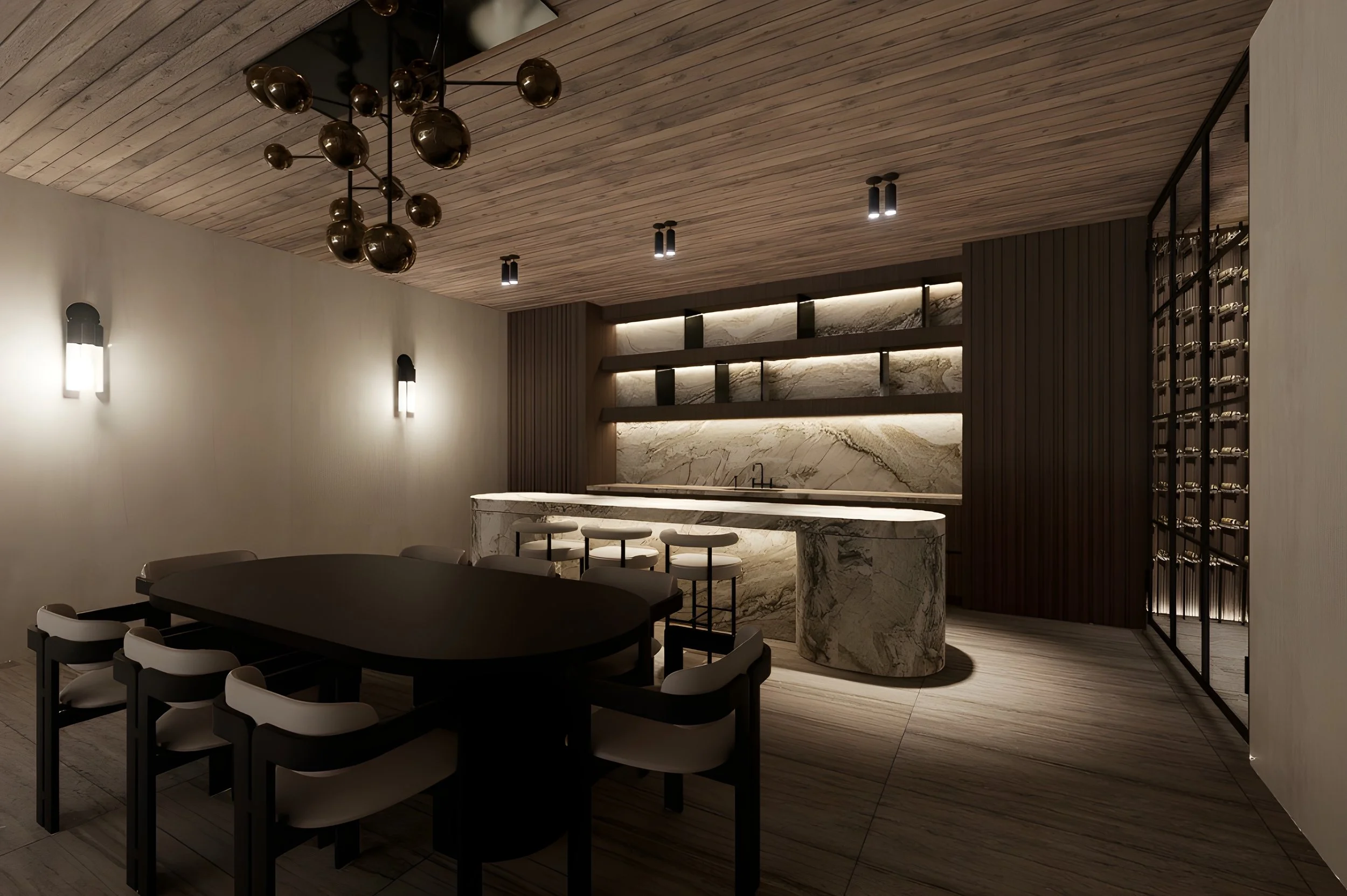 ALPINE is situated in the iconic Flats of Beverly Hills, a neighborhood where homes are admired not just for their architecture but for their presence on the street. The home is carved in elegance — a monolithic composition of warm, vein-cut travertine that anchors it in timeless serenity. The architecture is contemporary yet eternal, with linear geometry, floating planes, and expansive glazing. At the heart of the home are the kitchens — not just functional, but sculptural. Oversized islands emerge like art pieces from the wood floor, their volumes appear as if carved from a single block. Gallery-like. Iconic. Designed for conversation, creation, and quiet moments alike.