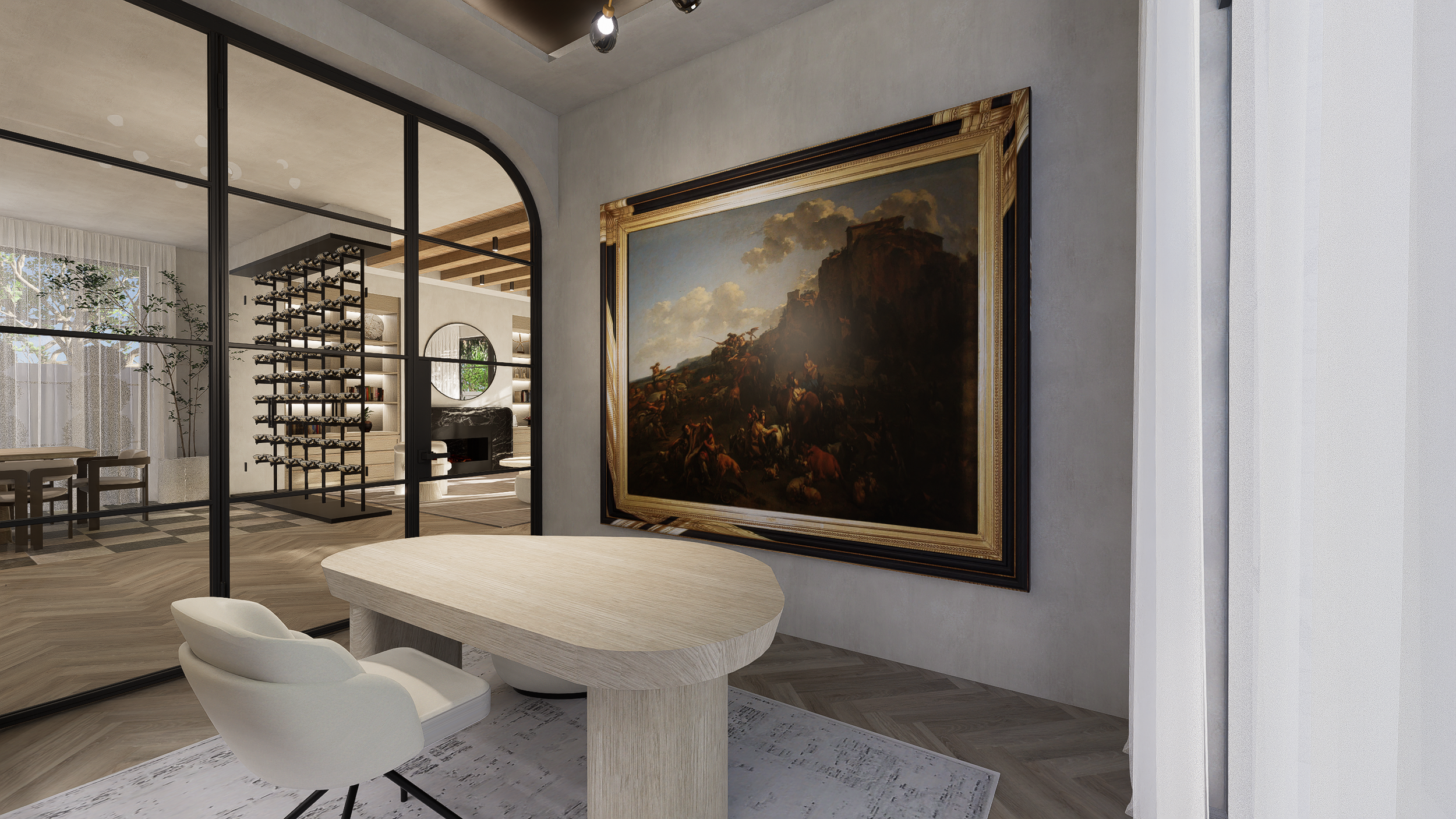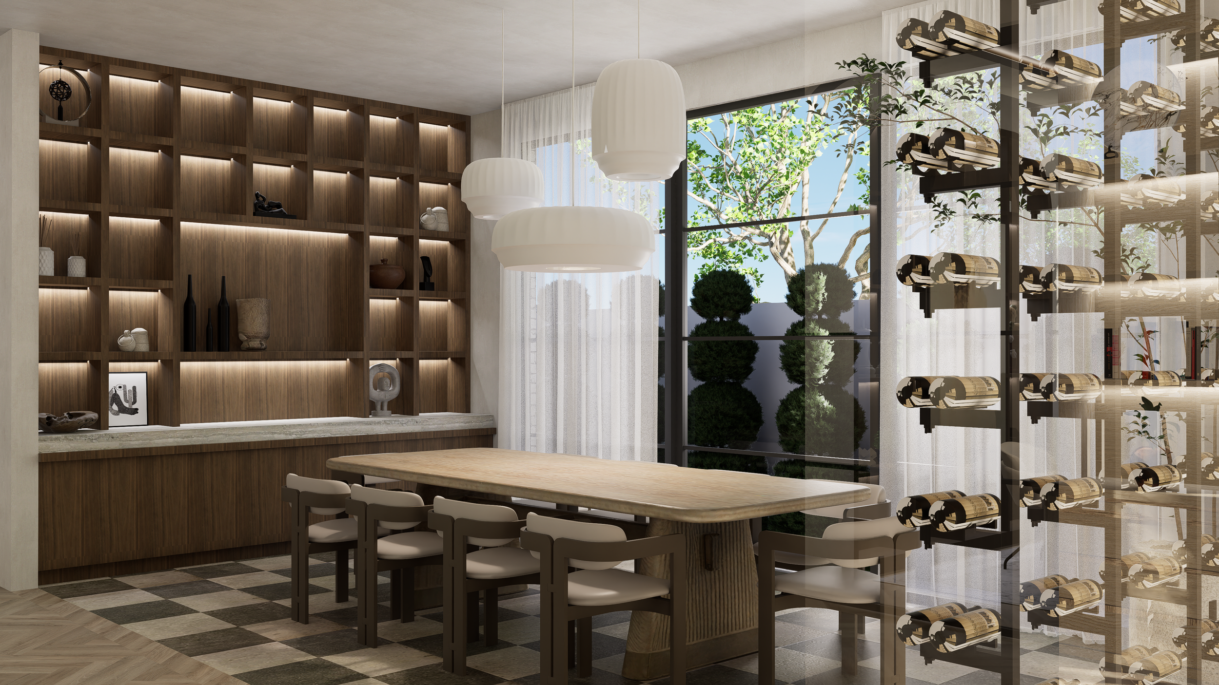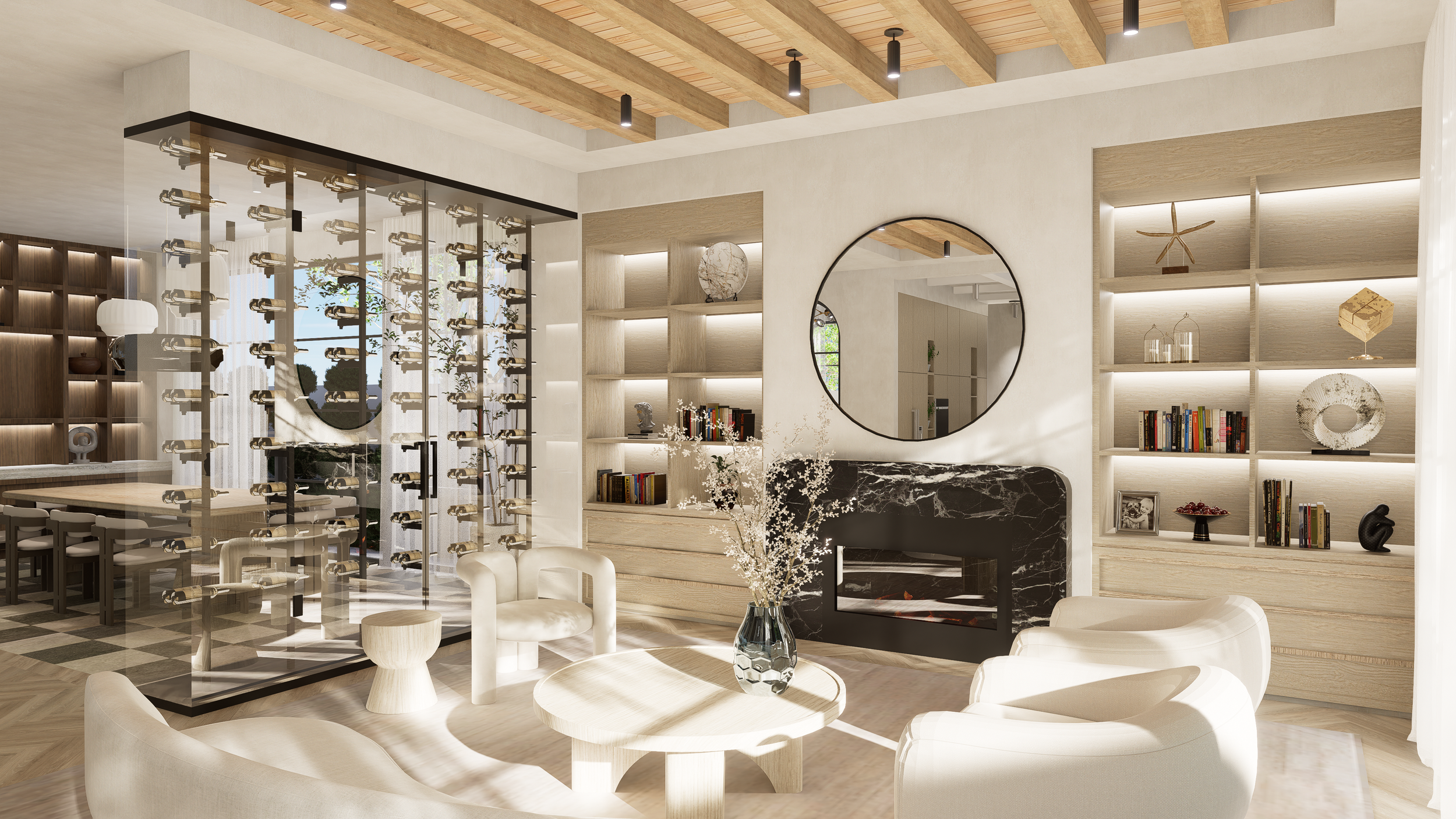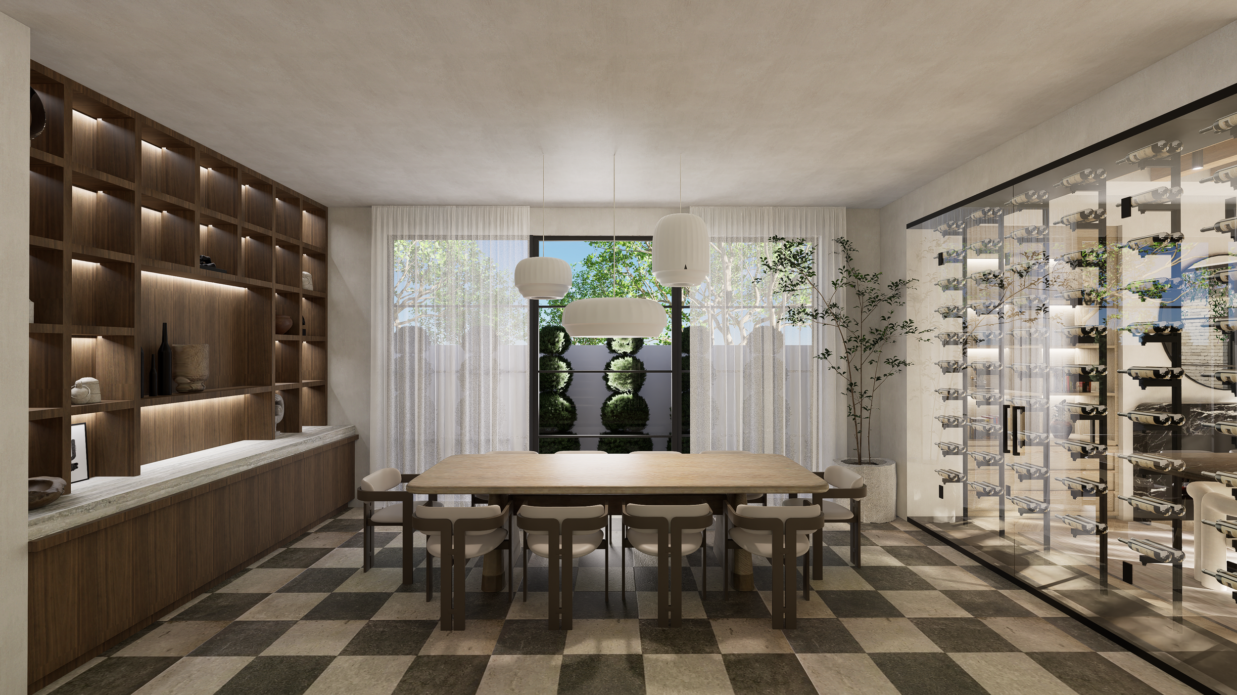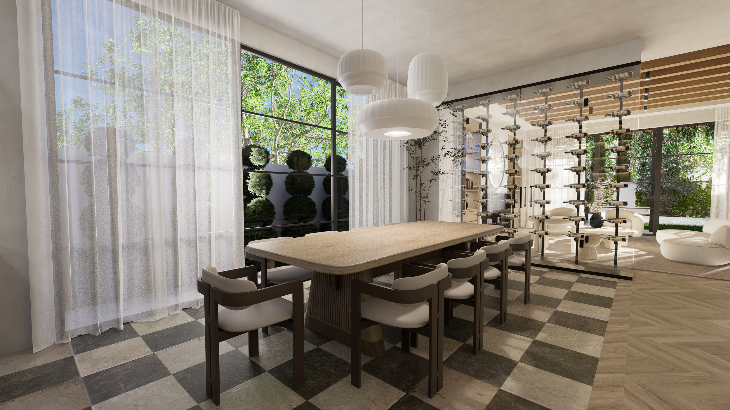 LAUREL, located in one of West Hollywood’s most coveted neighborhoods, this soft contemporary home balances warmth and sophistication through a curated blend of wood, natural plaster, and effortlessly light furnishings. The interiors are airy yet grounded, with materials chosen to age beautifully and feel lived-in from day one. A striking stone checkered floor anchors the dining room and wine cellar, adding visual rhythm and subtly defining the space within the open plan. Outside, the backyard is built for laid-back luxury — a chill pool house, full outdoor kitchen, and shaded cabana create the perfect setting for weekend gatherings and golden hour entertaining.