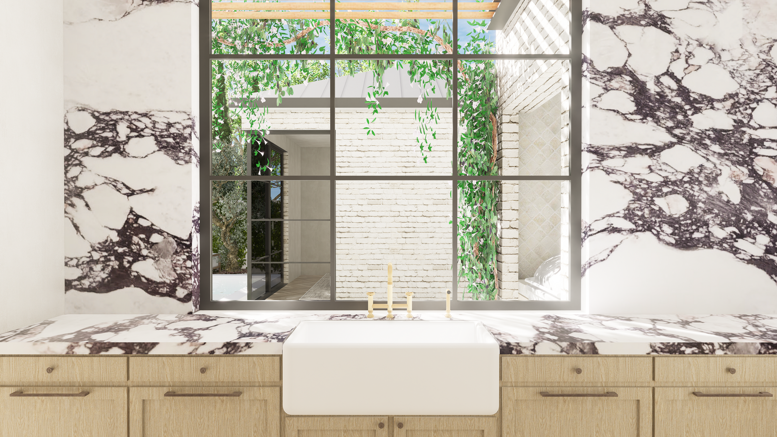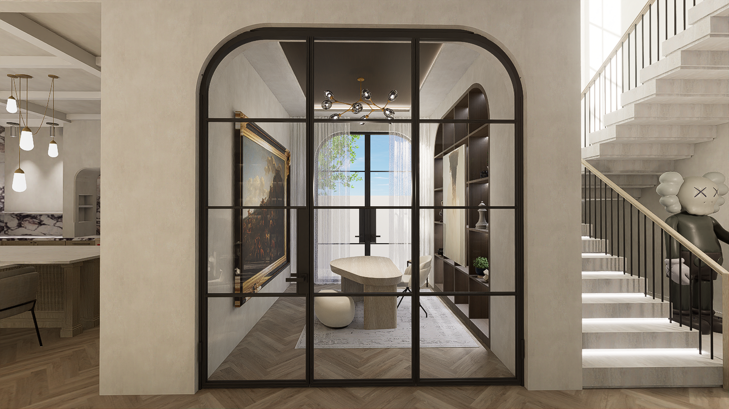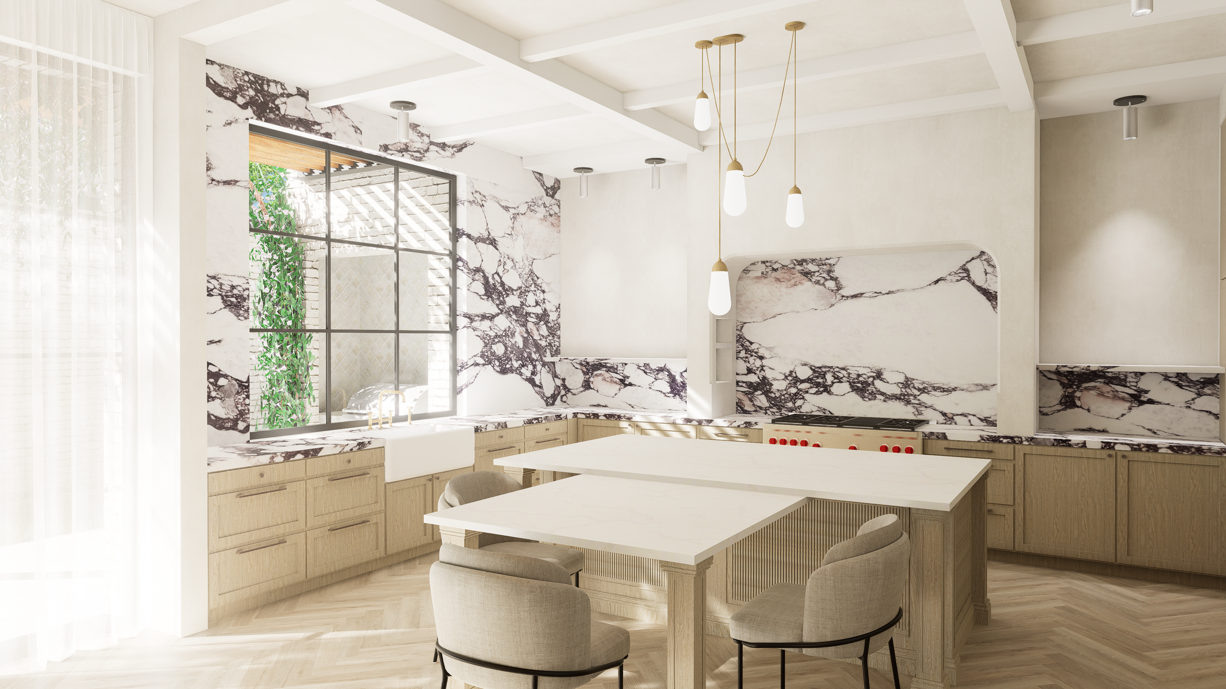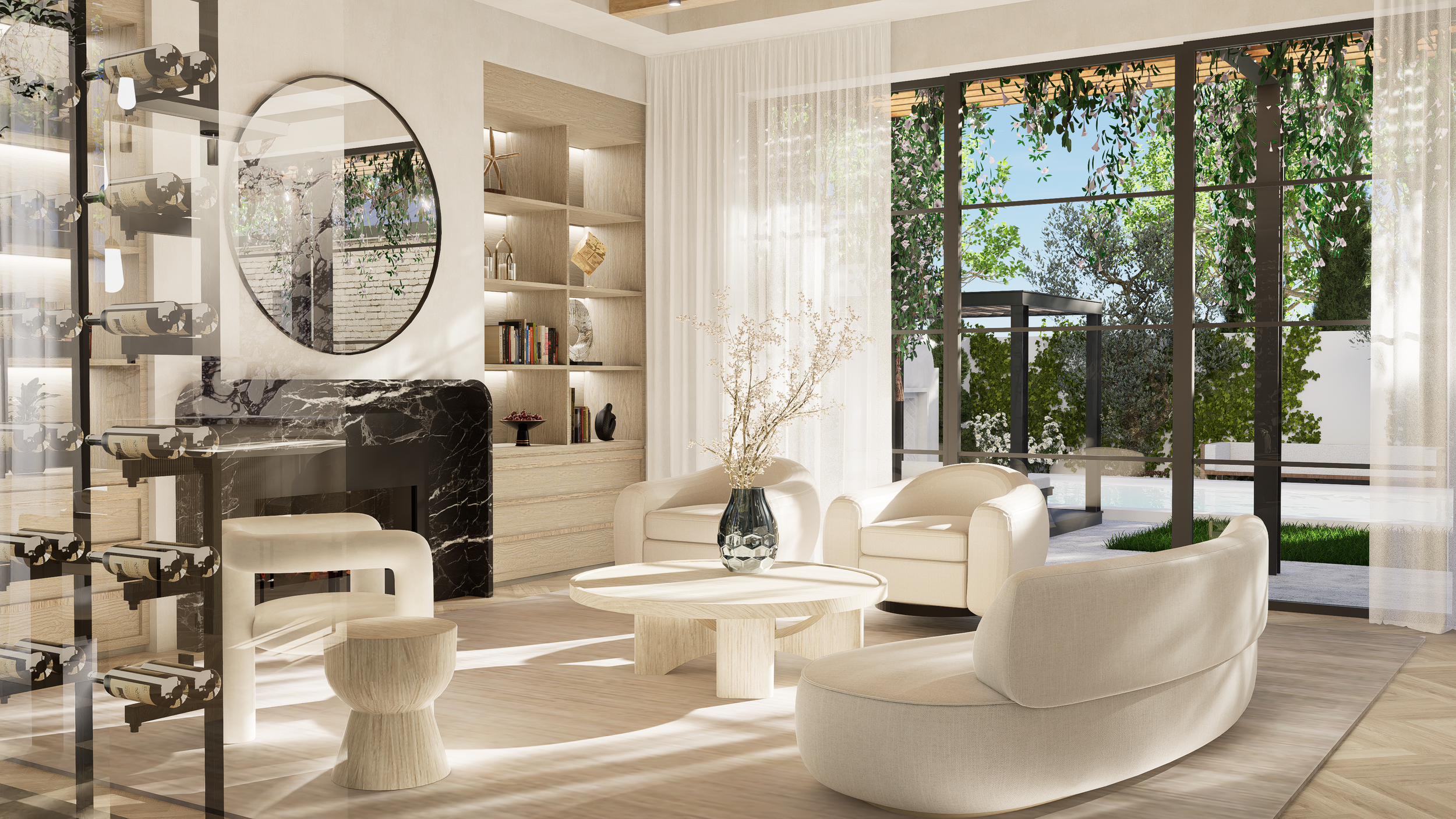LAUREL, located in one of West Hollywood’s most coveted neighborhoods, this soft contemporary home balances warmth and sophistication through a curated blend of wood, natural plaster, and effortlessly light furnishings. The interiors are airy yet grounded, with materials chosen to age beautifully and feel lived-in from day one. A striking stone checkered floor anchors the dining room and wine cellar, adding visual rhythm and subtly defining the space within the open plan. Outside, the backyard is built for laid-back luxury — a chill pool house, full outdoor kitchen, and shaded cabana create the perfect setting for weekend gatherings and golden hour entertaining.